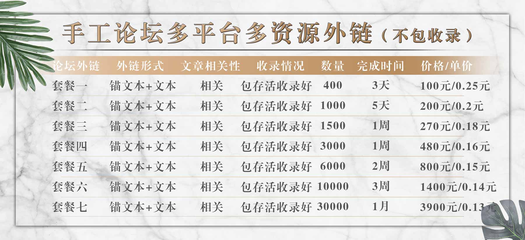 备注:手工多资源论坛外链,主要以平台多为主,广泛推广,多元化引蜘蛛,提升权重,虽然不包收录,但一般也有30%收录,是提升权重不错的选择!