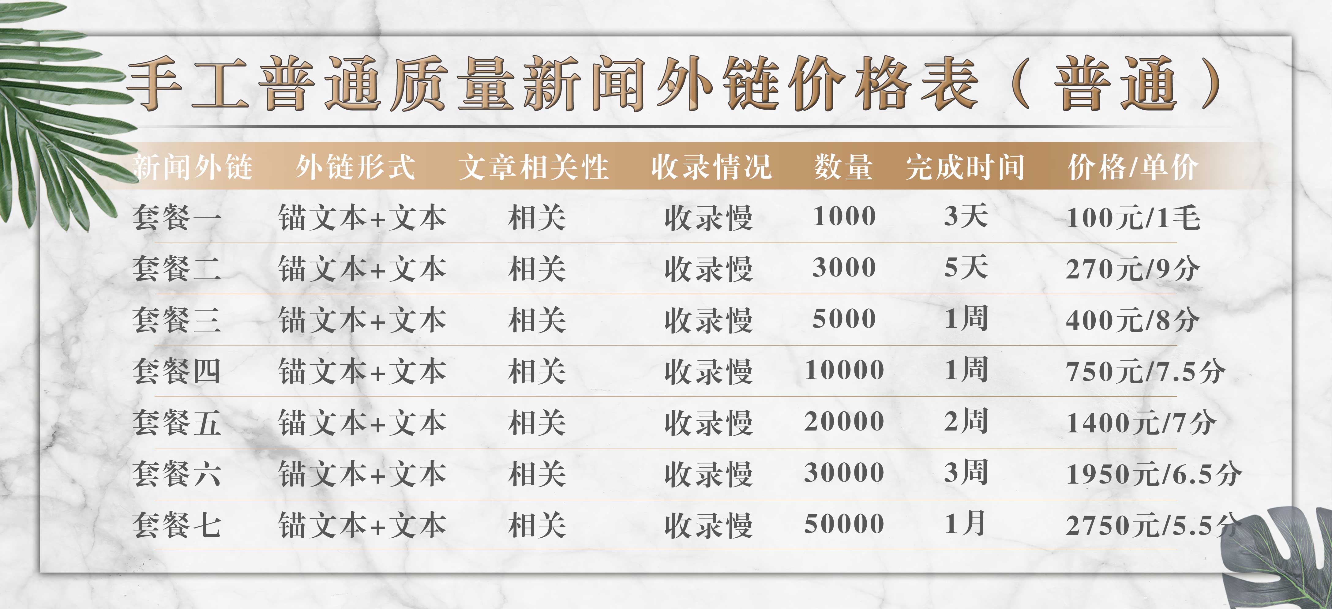 备注:普通质量新闻外链文章和关键词相关,也可客户自行提供文章,可随机发布5000家新闻网站,但不如高质量新闻外链收录好,价格低廉铺量也是非常不错的选择!